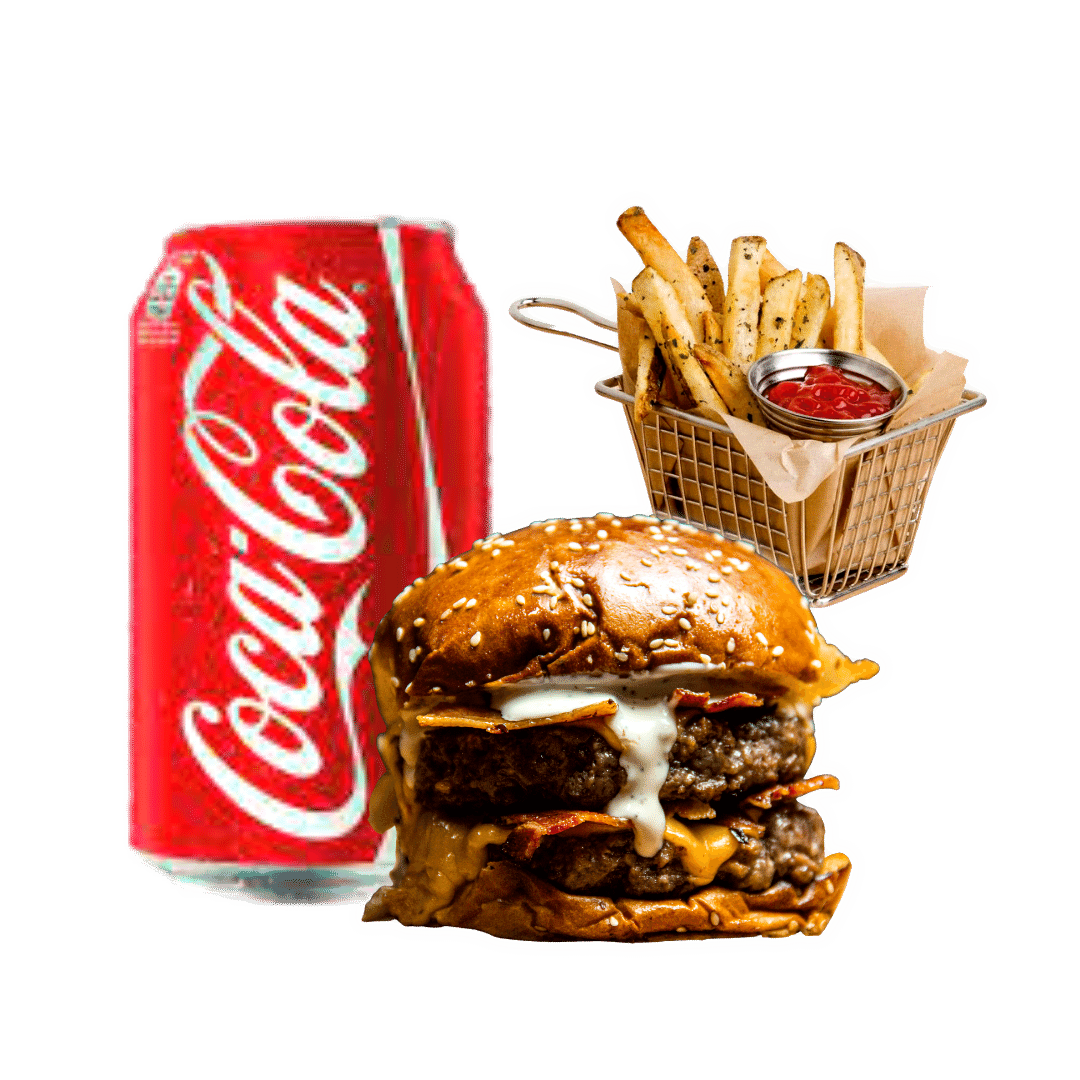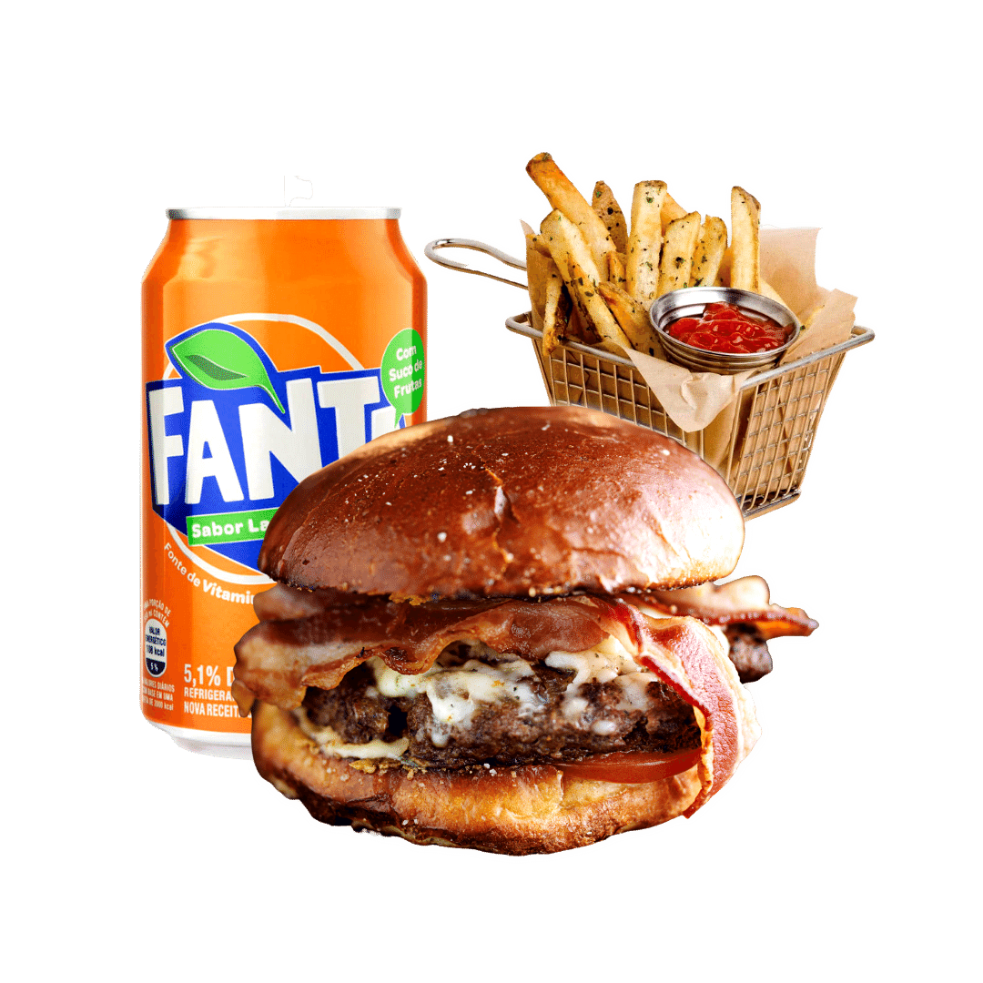 Delicioso pão de Brioche, blend super suculento de 180g, maionese da casa, acompanha fritas e um refrigerante lata 350 ml.